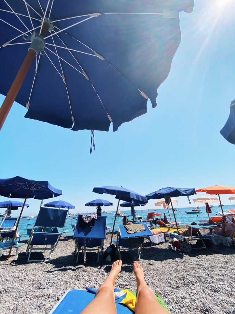 Então fomos para a praia do lado – Fornillo Spiaggia – acabamos pegando duas cadeiras e guarda sol por 25€ (duas pessoas), porque estávamos sem o nosso guarda sol e já tínhamos ficado a manhã toda debaixo do sol, mas essa praia é uma das que tem a parte pública.